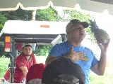The tour guide/owner gave a funny/good talk about the pineapple growing process. After asking for guesses on how to pick a ripe pineapple in the grocery store, He said look for uniform large eyes on the pineapple. Unlike other fruits it stops maturing as soon as it is harvested. He demonstrated an easy way to trim off the eyes and slice the pineapple on several pineapples which he then shared with us. He claims the bottom of the pineapple is the sweetest section because it ripens first. Each pineapple has two baby shoots. They leave one in place and plant the other in another field. This can be repeated four times. He had the driver pull over to a spot where we could see the blooms.